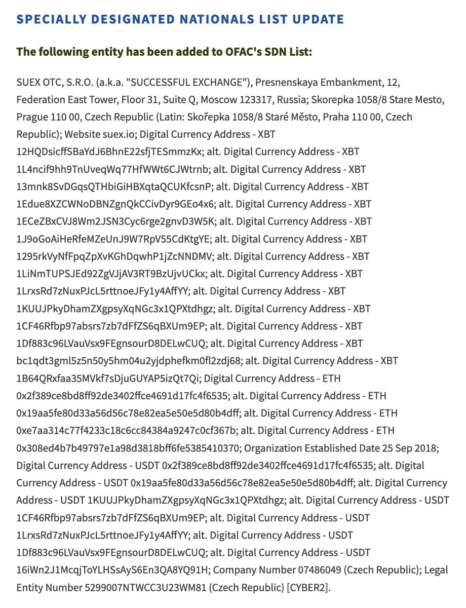 2/ This is in the light of the the recent OFAC notice against Suex (on paper in Prague, in practice in Russia) money-laundering front. They laundered BTC for the ransomware gangs.